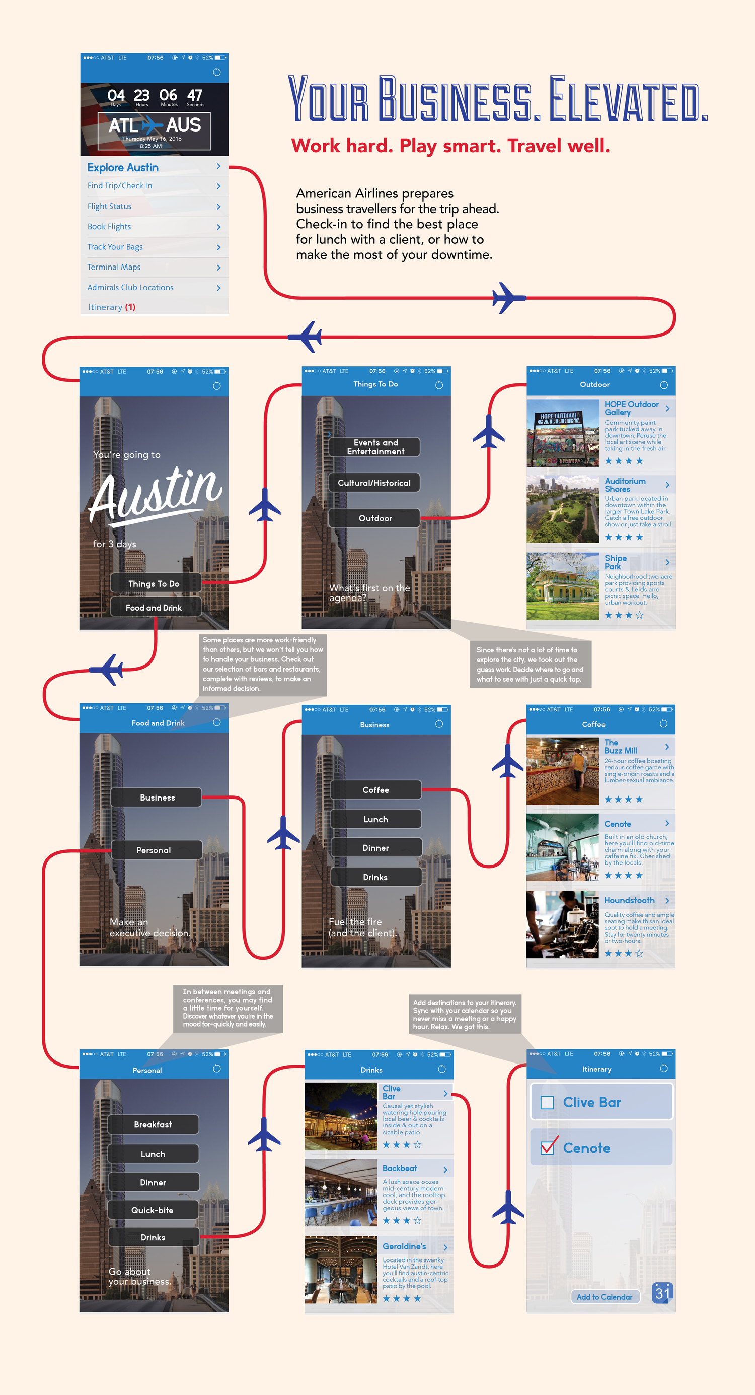 Partnering with a designer, we created this travel companion integration for the American Airlines app. We catered our integration to business travelers wanting to explore their destination and plan their itinerary all in one place, thus building brand trust and affinity.